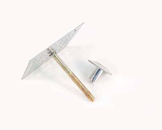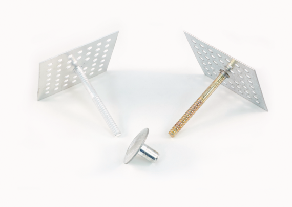 A perforated hanger with a stud that has annular rings. This is normally used for insulating boats/ship hulls and is covered by a Military Spec. A special Mushroom style Drive-On cap is used with these hangers, to secure the insulation.